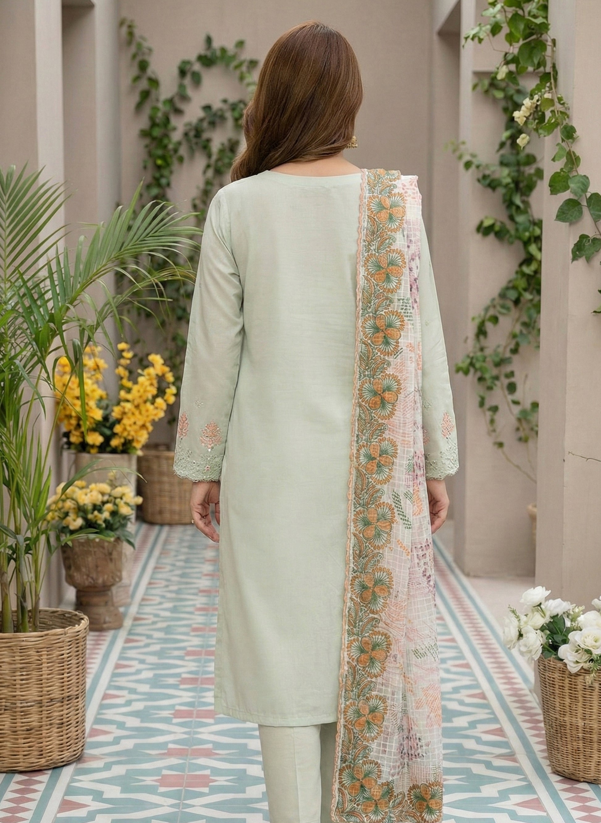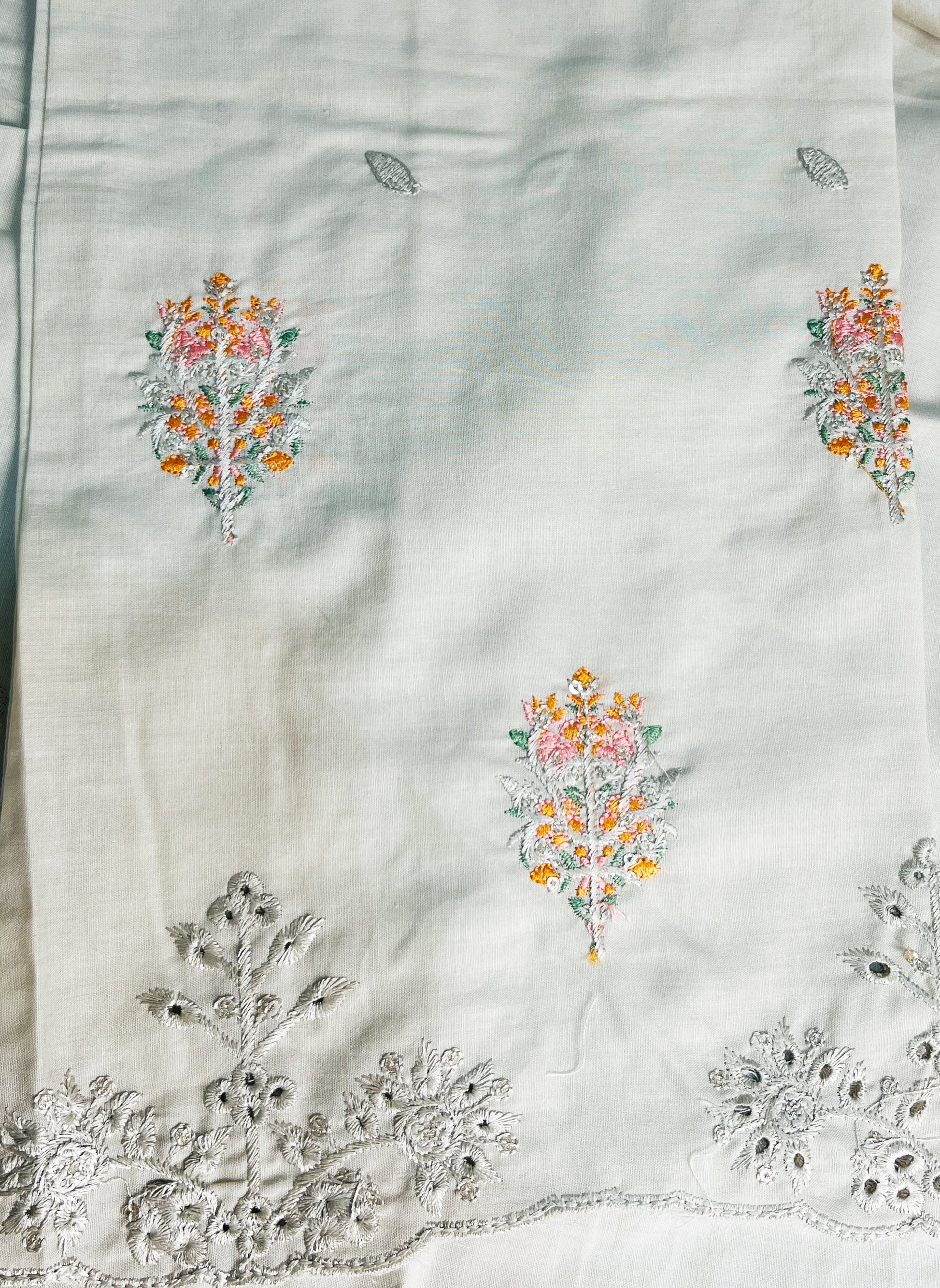 • Shirt: Premium Cambric Lawn (Chikan Kari Embroidery + Designer Neckline Work)